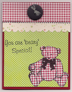 One of the first sets SU ever produced was the Button Bear on Foam.Every once in a while I think I want to sell it but it really is a nice set to use for a lot of occasions.The it's your bd card and beary special were made using Debbie Mumm and DCWV stacks.The bear has a pieced bow.I used a SU scallop punch for the top scallop.The crocheted flower is from CTMH and the decorative pin is from Superior Stick Pins.The button on the beary special card is from Stickopotumas.The beary special stamp is from Great Impressions C212.Grin and bear it stamp is from Art Impressions E1908.Really is fun to pull out the old stuff and create something new.